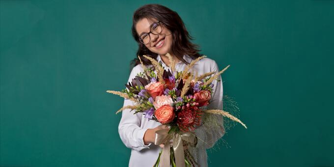 Zâmbet înflorat - buchet cu trandafiri și lyzianthus