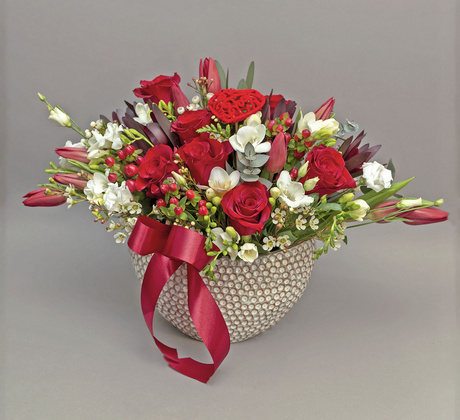 Martie de poveste - aranjament cu zambile și trandafiri