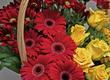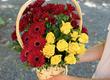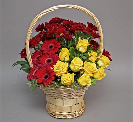 Expresie a unei laturi sensibile și frumoase, trandafirii galbeni, alături de crizanteme și de gerbera roșie sunt plini de romantism și de sinceritate!