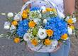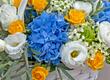 Hortensiile albastre, alături de lyzianthusul alb și minirosele galbene, creează un adevărat spectacol floral, ce va cuceri cu desăvârșire inimile persoanelor dragi din viața ta!