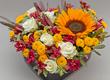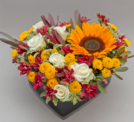 Unite într-o explozie de culori, de o frumusețe răvășitoare, crizantemele roșii și galbene, alături de trandafirii albi și floarea soarelui, descriu o adevărată poveste de iubire care a fost presărată de: prietenie, sinceritate, sprijin și încredere.