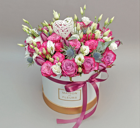 Cutia fericirii - aranjament cu trandafiri și crizanteme
