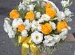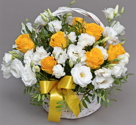 Trandafirii galbeni sunt cu adevărat cuceritori în preajma lyzianthusului alb, iar combinația florală devine una de neuitat!