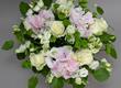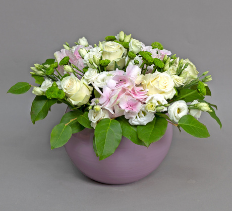 Ideală pentru înfrumusețarea decorului de la birou sau de la cabinet sau pur și simplu pentru o cină festivă în familie, combinația armonică de hortensia roz, trandafiri albi și lyzianthus, emană vibrații pozitive, naturalețe și prospețime!