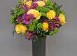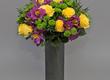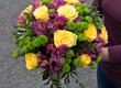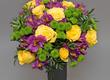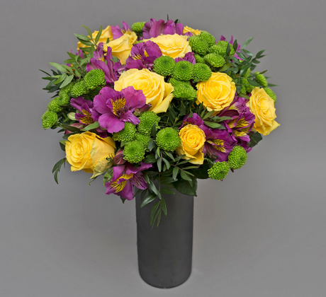 Pentru cei care mai cred în povești cu zâne, buchetul de trandafiri galbeni, alături de astromelia mov, îmbinate armonic cu santini verde, te poartă chiar pe tărâmurile fermecate ale ținuturilor de poveste.