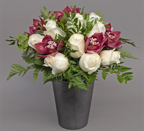 Dacă îți dorești un buchet deosebit pentru a impresiona pe cineva delicat, buchetul elegance este alegerea potrivită. Trandafirii albi, alături de cymbidiumul vișiniu, îmbinate armonic într-un buchet elegant, în culori deschise și calde, devin ideali pentru o doamnă sau domnișoară cu gusturi rafinate.