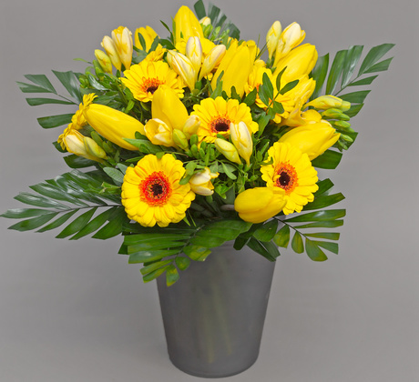 Oricât ar fi ziua de mohorâtă, un asemenea buchet va aduce cu siguranță soarele în casa și pe chipul cuiva. Un buchet într-o culoare vibrantă și puternică, menit să alunge monotonia unei zile întunecate. Galbenul este culoarea simbolică a prieteniei, așadar un buchet cu flori galbene este un cadou perfect pentru cineva apropiat.
