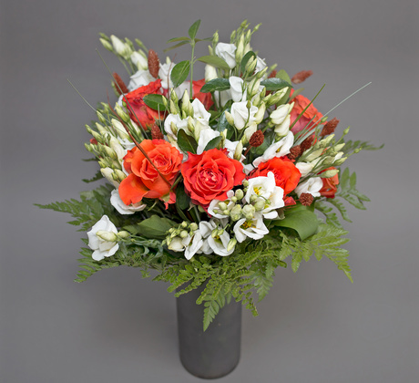 Dacă îți este dragă, trimite-i un buchet luminos și energic, compus din trandafiri portocalii și lyzianthus alb, pentru a sublinia atât tăria sentimentelor ce vă unesc, cât și puritatea acestora. Spune-i ”te iubesc” în cel mai înfloritor mod!