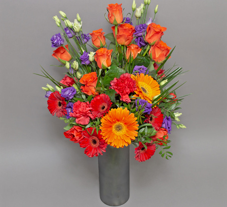 Florile ne bucură privirea și de cele mai multe ori pot să ne aducă zâmbetul pe chip chiar și într-o zi mai puțin frumoasă. Plin de culoare, naturalețe și optimism buchetul mix de gerbera portocalie, garoafe roșii, lyzianthus mov și trandafiri portocalii, este cadoul perfect pentru momentele în care vrem să transmitem cuiva cele mai sincere și frumoase urări.