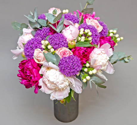 Florile sunt cu siguranță darul cel mai sincer și mai prețios pe care îl poți oferi unei persoane deosebite din viața ta. Regele florilor, bujorul, în cele mai parfumate și mai colorate forme ale sale, alături de allium, minirose și eucalipt, au fost unite într-un buchet romantic și pastelat.