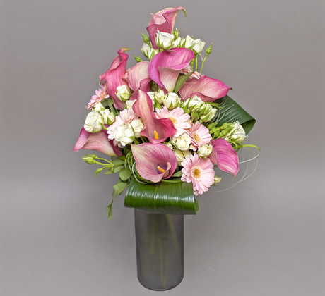 Calele roz alături de minirosele albe, sunt simbolul perfect al rafinamentului si al frumosului. Mâinile iscusite ale florăreselor noastre de nădejde au creat un buchet deosebit, pentru momentele când vrei să-i arăți cât este de specială, pentru că atunci când te uiți la o floare este imposibil să nu te gândești la perfecțiunea ei.