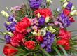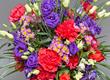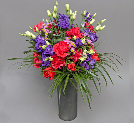 Perfect pentru o persoană pozitivă, veselă și energică, buchetul mix de garoafe roșii, lyzianthus mov și crizanteme roz, pictat în cele mai vii și stridente culori, o va face să radieze de fericire!
