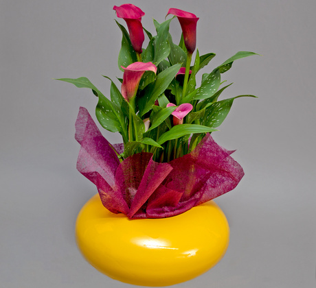 Cala purpurie în vas ceramic decorativ este cu siguranță un cadou perfect de dăruit unei persoane extravagante, care iubește ineditul! Culoarea puternică a florilor și postura elegantă a acestora, vor părea ideale pentru completarea colțului monoton de la birou sau din sufragerie.
